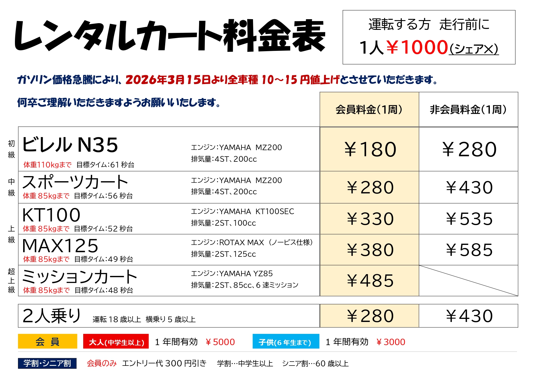 ガソリン価格急騰により、3月15日より一部料金を変更します。