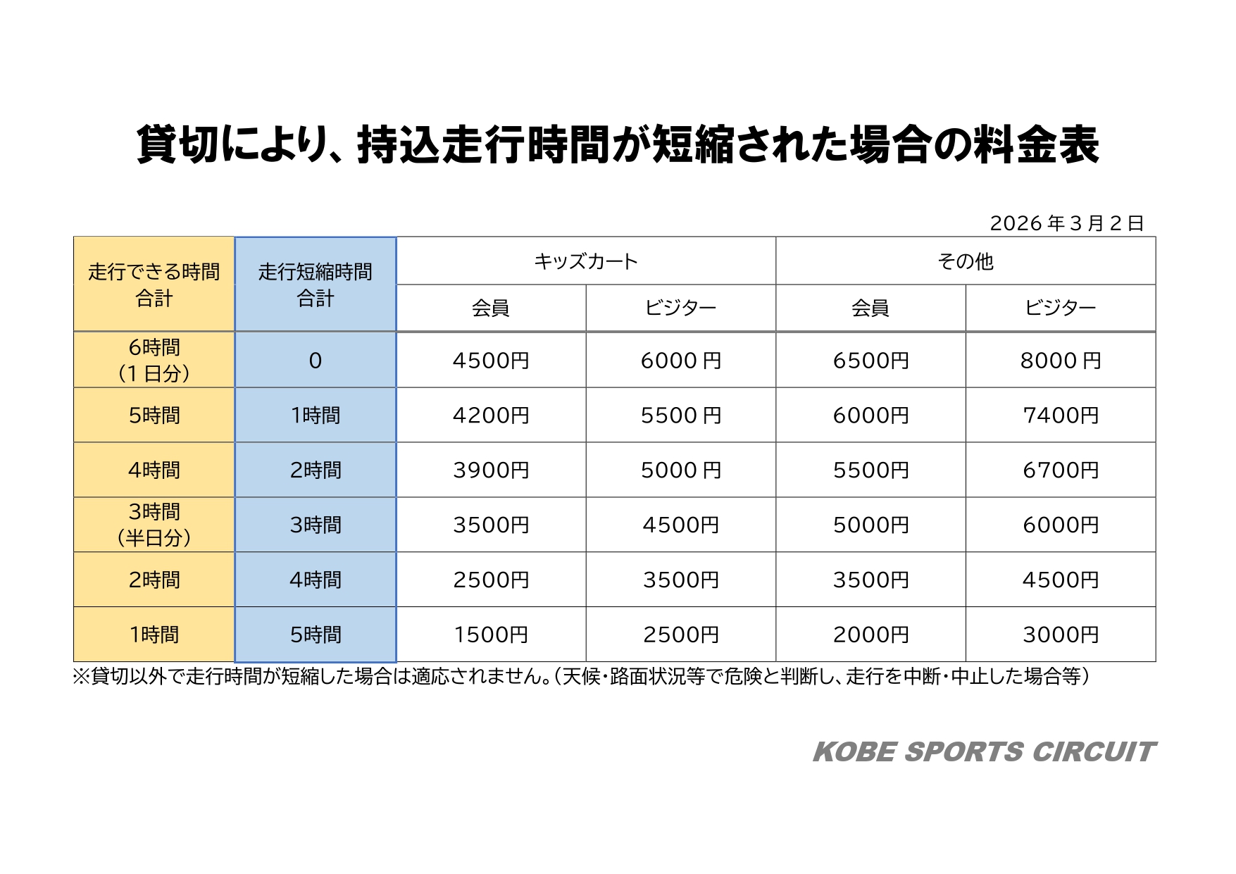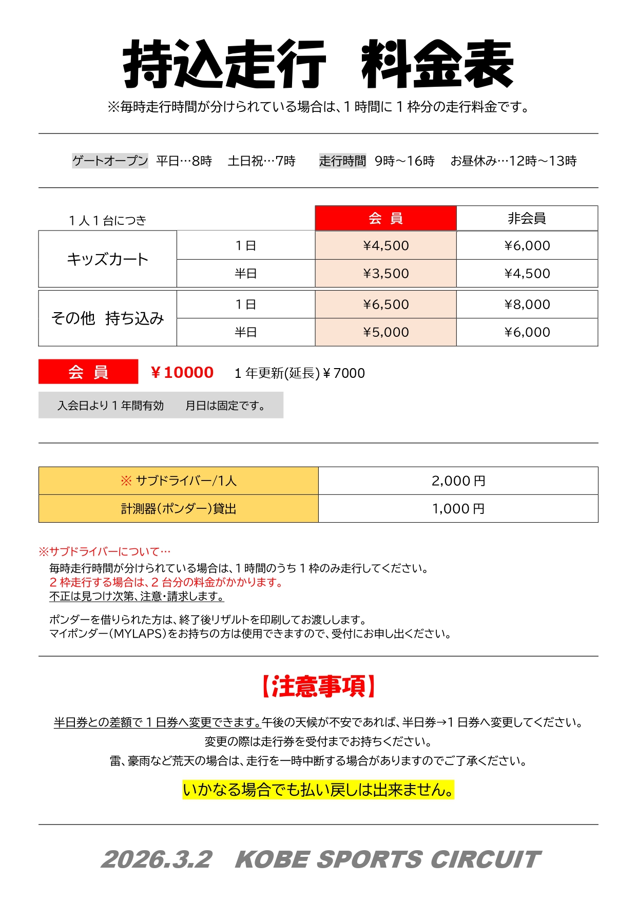 ●レンタルカート専用時間 12:00〜13:00・16:00〜19:00(1-2月 平日16:00〜18:00)